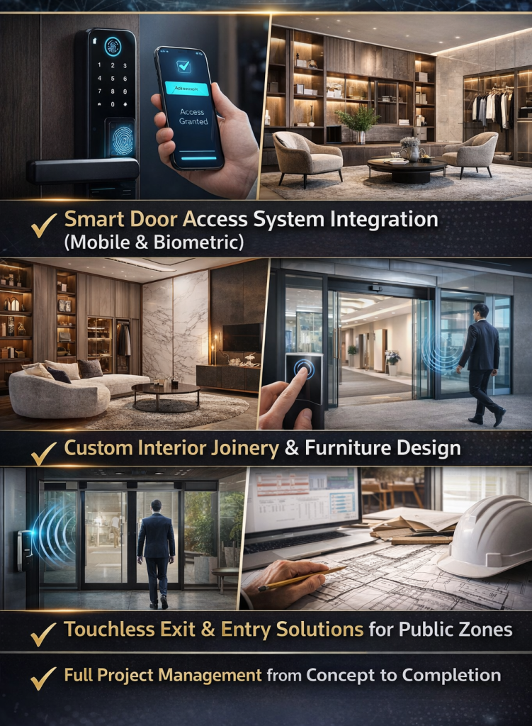 • Expert Integration: Vhome Design Solutions ensures that security hardware like electromagnetic locks and sensors are hidden within the architecture, maintaining a clean, “Quiet Luxury” aesthetic.