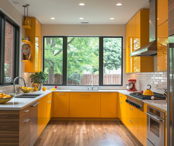 A U-shaped kitchen contains an arrangement of different kitchen units positioned on three adjacent walls that makes it appear to form the shape of the letter ‘U’.