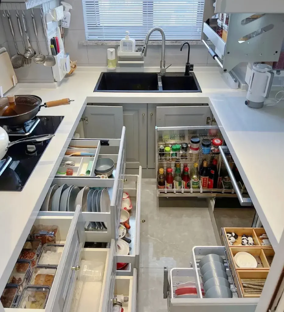 The U-shape design gives you lots of counter space on three sides, perfect for cooking and preparing meals. It offers plenty of room to work and keep your kitchen items organized, which helps reduce clutter and makes everything more efficient.